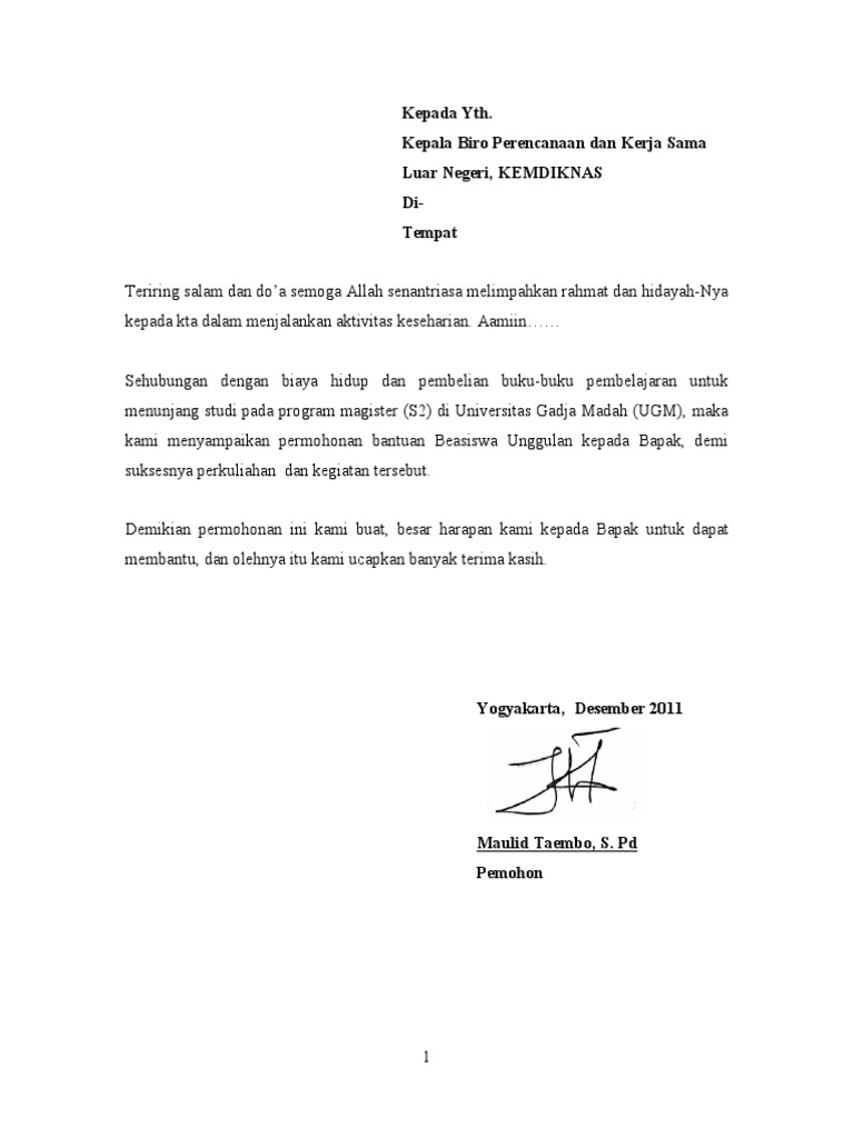 Pada bagian pembuka, tuliskan nama Anda serta keterangan bahwa Anda adalah mahasiswa penerima beasiswa dari pemerintah kabupaten.