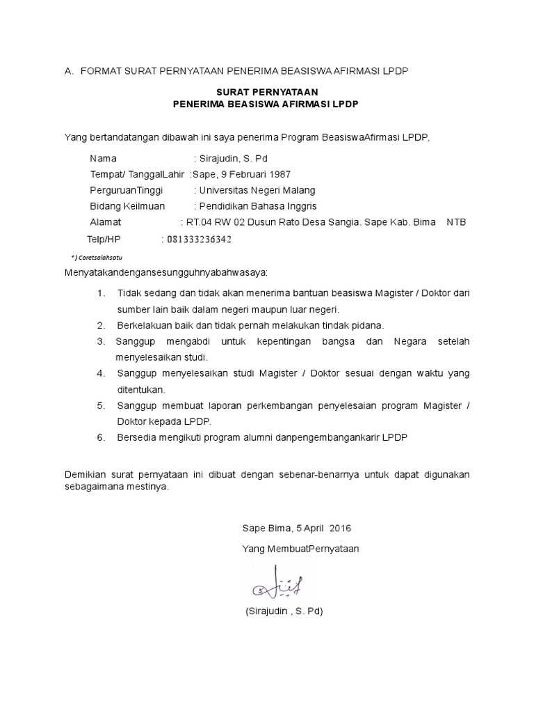 Berikut adalah contoh surat pernyataan beasiswa pemkab: